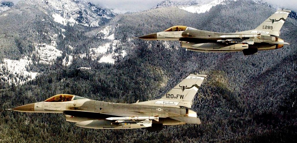General Dynamics F-16C Fighting Falcon aircraft from the 186th Fighter Squadron Vigilantes, 120th Fighter Wing, Montana Air National Guard.