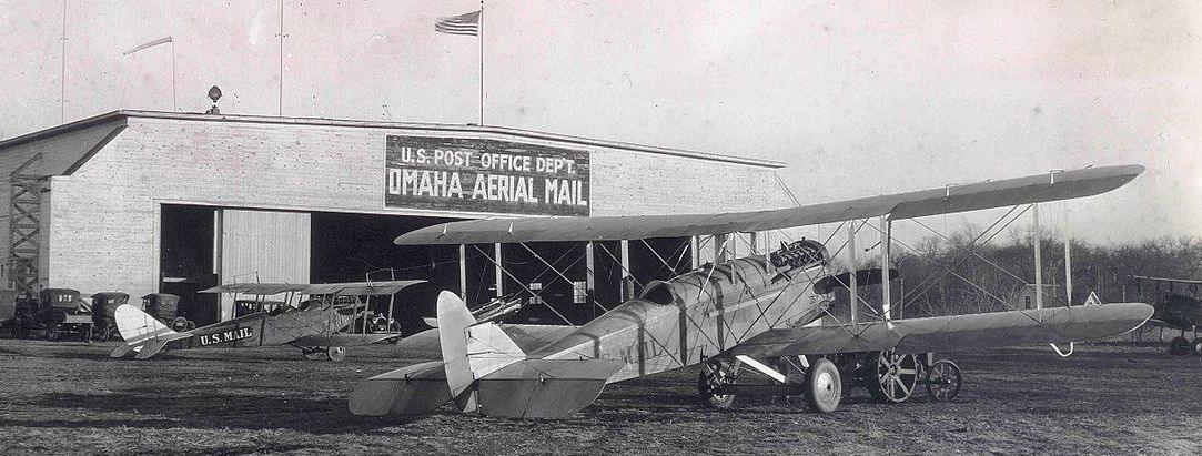 The first airmail field used by the Post Office Department in Omaha, Nebraska was known as Ak-sar-Ben Field (or Nebraska, spelled backwards). The field was part of the transcontinental flyway between New York City, New York to San Francisco, California. The airfield was the site of one of the most dramatic events in the early years of the airmail service; pilot Jack Knight’s historic flight during a demonstration of night flying. Due to the limited instrumentation of the time and lack of beacon lighting, flying time was limited by the length of the day. Knight was originally scheduled to fly just one leg of the first day and night-time transcontinental airmail trip on 22 Feb 1921. He left North Platte, Nebraska, flying the mail eastward to Omaha, where he arrived well after dark and in the middle of a snowstorm. Knight was able to land safely at the Omaha field because it was lit by a line of burning gasoline drums placed along the runway. The relief pilot refused to continue west to Chicago , Illinois through the storm. Knight volunteered to take the flight. He took off for Chicago at 2 am with only a road map to guide him over terrain he had not even crossed in daylight hours. Amazingly, Knight successfully completed the flight into Chicago, winning national applause for his daring feat. Photo taken ca 1920.