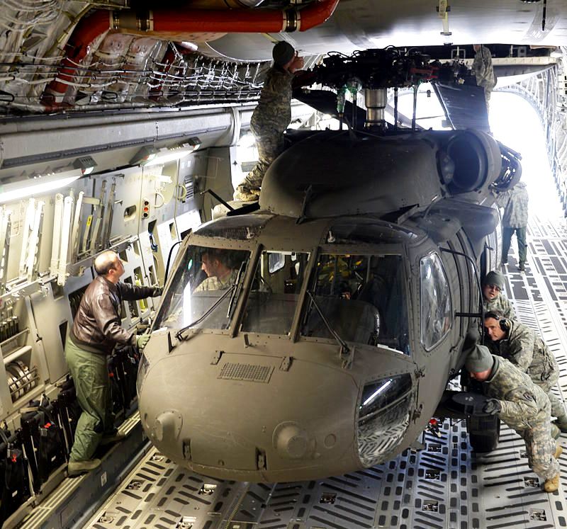 Airmen and soldiers from the Nebraska National Guard push two UH-60 Black Hawk helicopters onto a C-17 from the Missouri Air National Guard’s 172nd Airlift Wing. The Missouri ANG transported the helicopters and soldiers from the 135th General Support Aviation Battalion to Elmendorf Air Force Base, Alaska, for training 10 Apr 2013, at the 155th Air Refueling Wing.