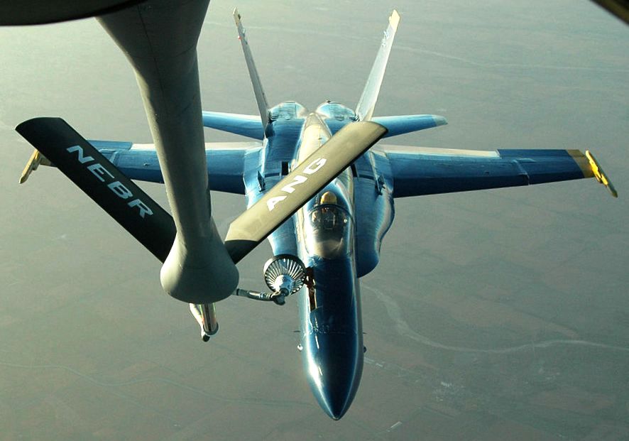 McDonnell Douglas F/A-18 Hornet flown by the U.S. Navy Blue Angels is refueled by a Nebraska Air National Guard KC-135R Stratotanker aircraft over Nebraska on 24 Sep 2006.