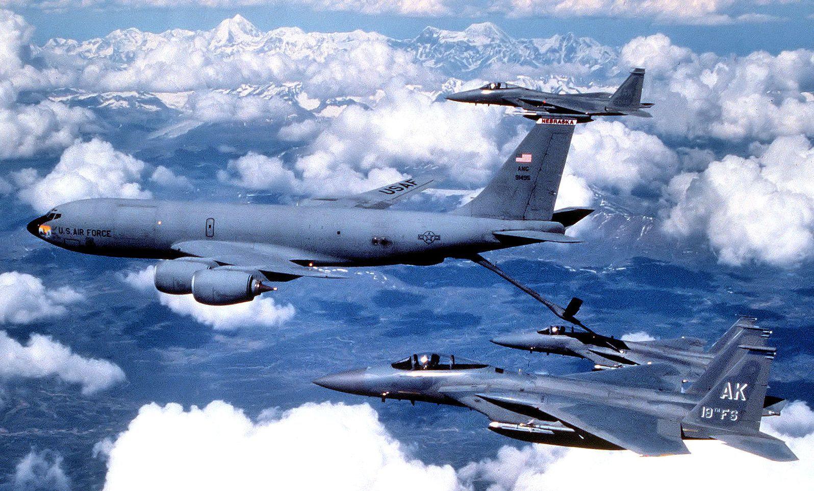 Boeing KC-135R Stratotanker (Serial No. 59-1495), 173rd Air Refueling Squadron, 155th Air Refueling Wing, Nebraska Air National Guard, refuels Mcdonnell Douglas F-15C Eagle fighters from the 19th Fighter Squadron from Elmendorf Air Force Base over Alaska during excercise “Northern Edge ’96”, 1996.