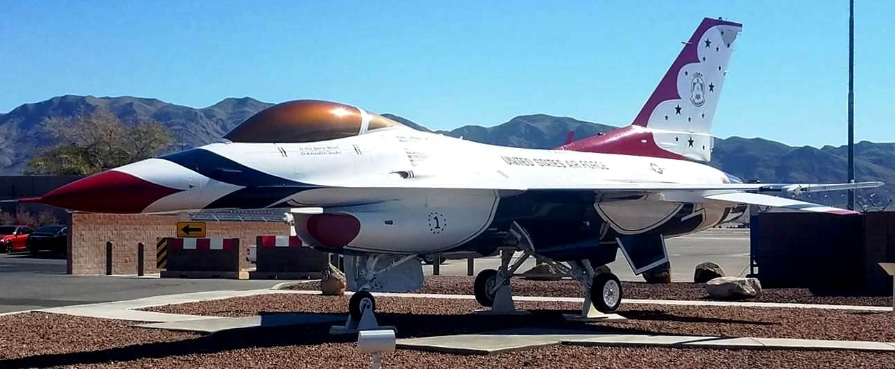 Nellis AFB is located 8 miles northeast of Las Vegas. It is Headquarters, Air Warfare Center, and home to 57th Wing; Air Demonstration Squadron (Thunderbirds); Air Force Weapons School; and 66th Rescue Squadron. It also houses the Threat Training Facility. Nellis AFB is named for 1st Lieutenant William H. Nellis, a Second World War P-47 Thunderbolt pilot who was killed in Europe 27 December 1944.