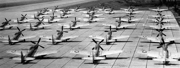 Thirty-one North American P-51H Mustangs of the 82nd Fighter Group on the ramp at Grenier AFB, Manchester, New Hampshire.