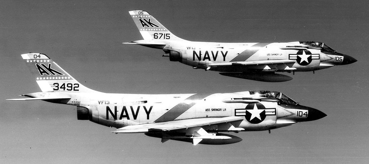 McDonnell F3H -1N Demon (BuNo. 133492), 104 and F3H-2/F-3B Demon (BuNo. 146715), 105, Fighter Squadron VF-13 “Night Cappers” in flight. (NMNA Photo)
