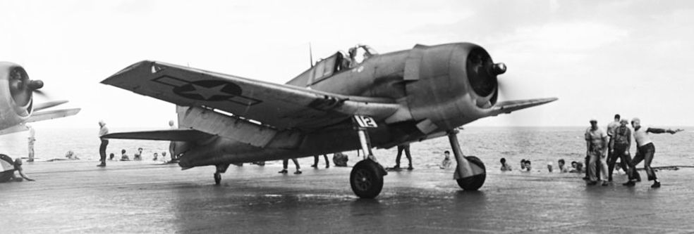 Grumman F6F-3 Hellcat from Fighting Squadron 9 (VF-9) is given the go-ahead for takeoff from the aircraft carrier USS Essex (CV-9) on the first day of “Operation Hailstone”. The USS Intrepid (CV-11) is another Essex-class carrier. (USN Photo)