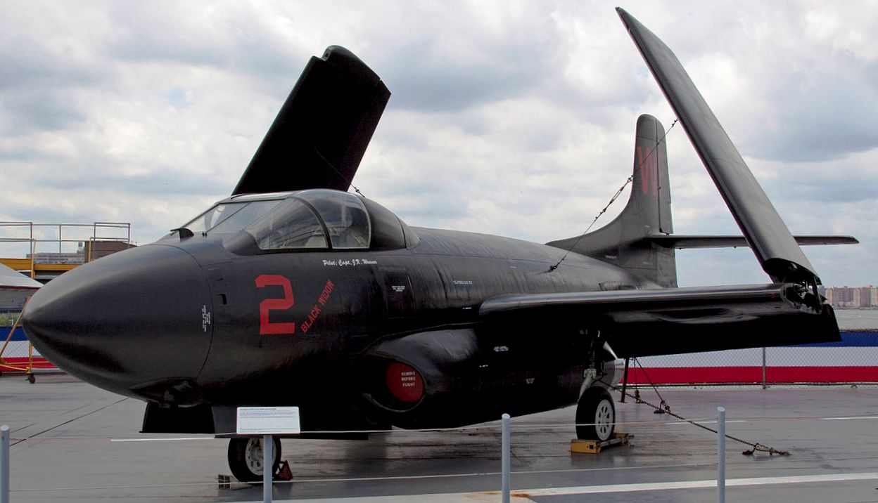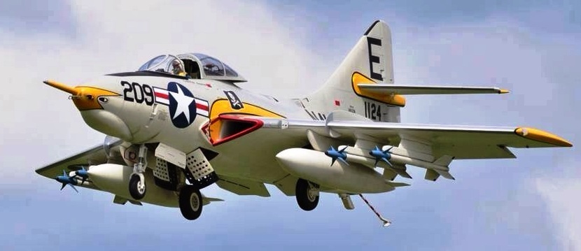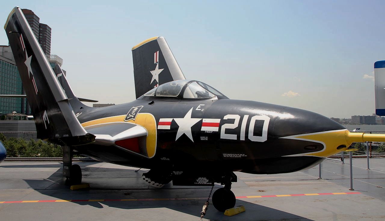 Grumman F9F-8 Cougar (BuNo. 141124) approaches for a landing. This is a model aircraft painted in the colours of Fighter Squadron 61 (VF-61) “Jolly Rogers” by Tony Quist. VF-61 was assigned to Carrier Air Group 8 (CVG-8) aboard the aircraft carrier USS Intrepid (CVA-11) for a deployment to the Mediterranean Sea from 12 March to 15 September 1956. Note the AIM-9L Sidewinder missiles under the wings (not used by this aircraft during its carrier service).