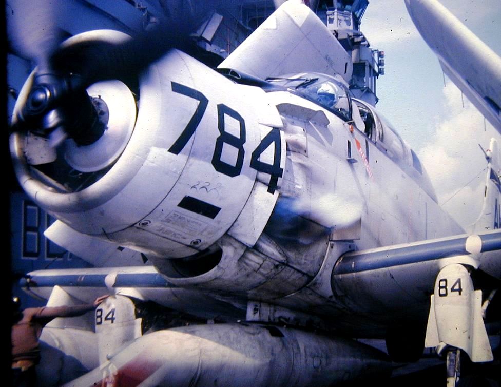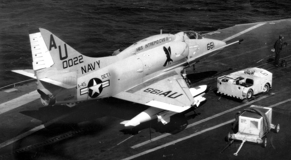 A U.S. Navy Douglas A-4E Skyhawk (BuNo. 150022) from Attack Squadron VA-45 Det.1 “Blackbirds” aboard the aircraft carrier USS Intrepid (CVS-11) in 1971 . VA-45 Det.1 was assigned to Carrier Anti-Subarine Air Group 56 aboard the USS Intrepid for a deployment to the North Atlantic Ocean from 11 July to 15 October 1972.