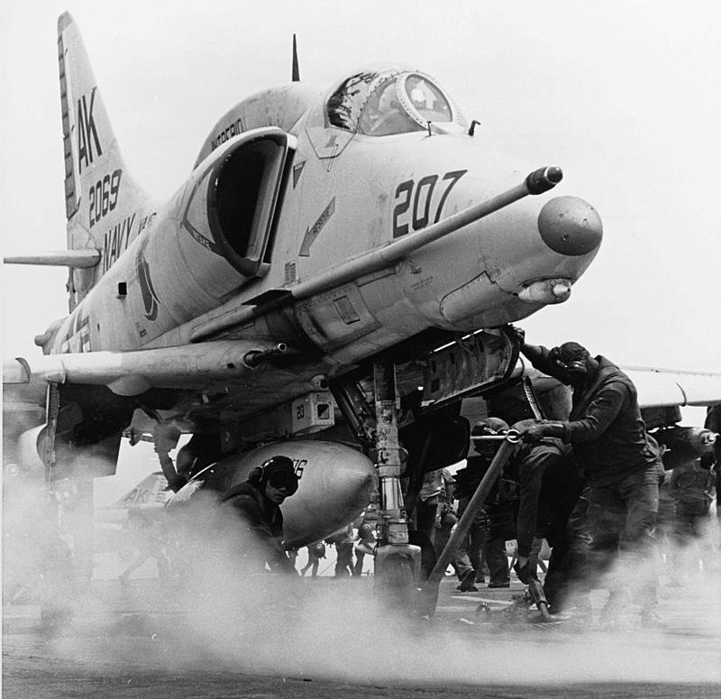 Douglas A-4E Skyhawk (BuNo. 152069) attack plane from Attack Squadron 106 (VA-106) “Gladiators” is brought to the launching position on a steam catapult aboard the aircraft carrier USS Intrepid (CVS-11), during flight operations in the Gulf of Tonkin, September 1968. Note the nosewheel steering bar in use. Although being classified as an anti-submarine carrier, Intrepid made three deployments to Vietnam as an attack carrier with Attack Carrier Air Wing Ten (CVW-10) embarked, the one when the photo was taken, from 4 June 1968 to 8 February 1969, being the last one.