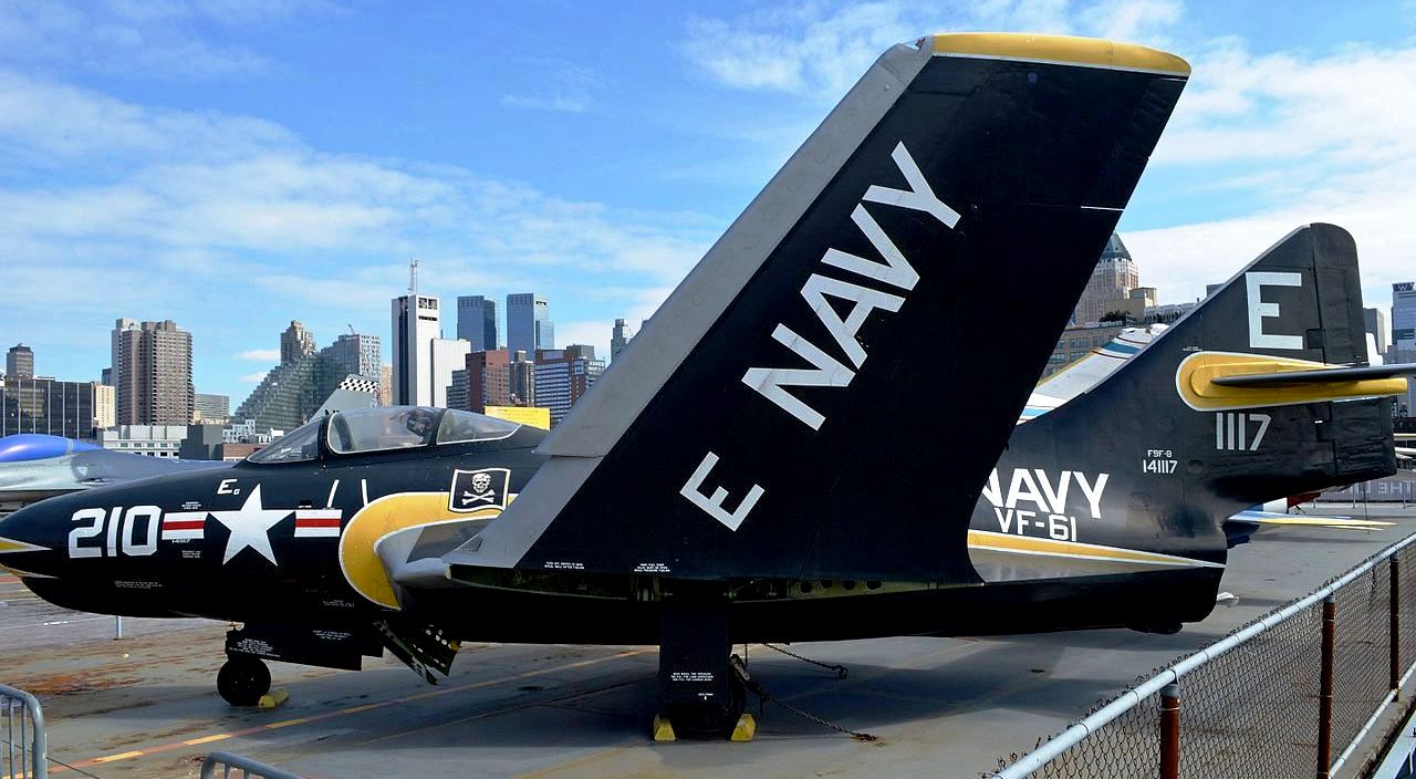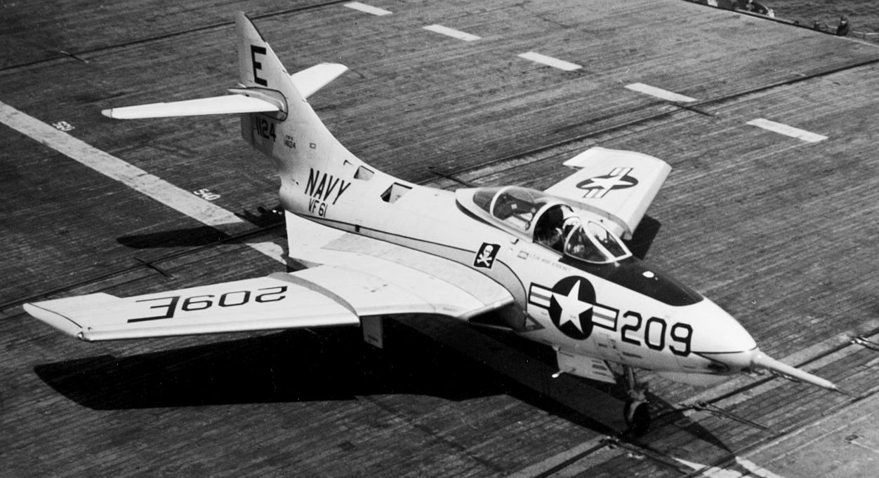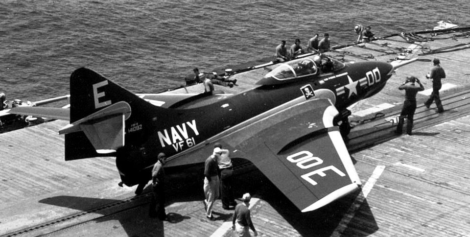 Grumman F9F-8 Cougar (BuNo. 141124) of Fighter Squadron 61 (VF-61) “Jolly Rogers” on the flight deck of the aircraft carrier USS Intrepid (CVA-11), 25 April 1956. Note the squadron insignia under the cockpit. VF-61 was assigned to Carrier Air Group 8 (CVG-8) aboard the Intrepid for a deployment to the Mediterranean Sea from 12 March to 5 September 1956. (USN Photo)