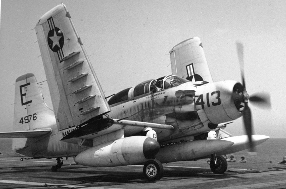 A U.S. Navy Douglas AD-5 Skyraider (BuNo. 134976) from Attack Squadron 85 (VA-85) taxies forward after landing on the flight deck of the aircraft carrier USS Intrepid (CVA-11) on 20 April 1956. Note the squadron insignia under the cockpit . VA-85 was assigned to Carrier Air Group 8 (CVG-8) aboard the Intrepid for a deployment to the Mediterranean Sea from 12 March to 5 September 1956.