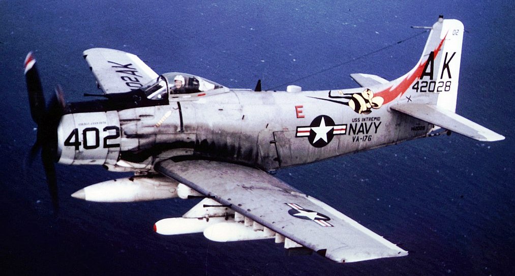 Douglas A-1J Skyraider (BuNo. 142028) of Attack Squadron 176 (VA-176) “Thunderbolts” in flight. VA-176 was assigned to Attack Carrier Air Wing 10 (CVW-10) aboard the aircraft carrier USS Intrepid (CVS-11) for a deployment to Vietnam from 4 April to 21 November 1966. (NMNA Photo)