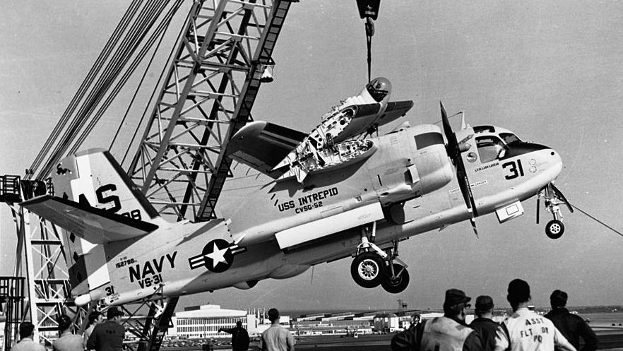 A U.S. Navy Grumman S-2E Tracker (BuNo. 152798) of Anti-Submarine Squadron 31 (VS-31) “Topcats” is hoisted aboard the aircraft carrier USS Intrepid (CVS-11) from the pier at Naval Air Station Quonset Point, Rhode Island, on 30 September 1969.