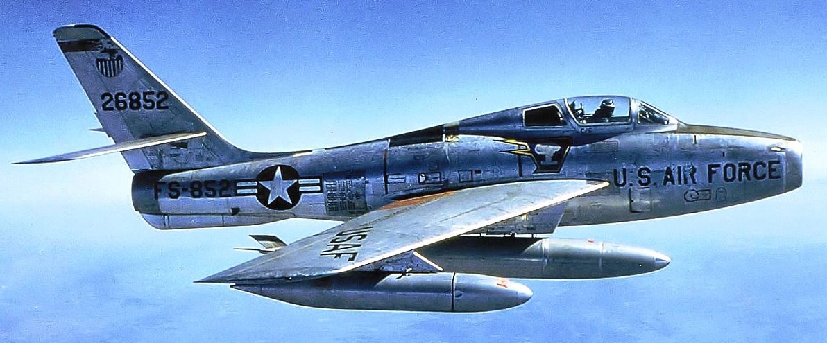 Republic F-84F-50-RE Thunderstreak (Serial No. 52-6852) of the 91st Fighter-Bomber Squadron, RAF Bentwaters UK, 31 Dec 1956. (USGOV-PD Photo)