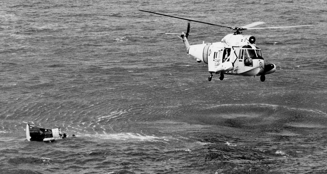 A US Coast Guard Sikorsky HH-52A Seaguard helicopter over the Gemini 3 space capsule flown by astronauts Gus Grissom and John Young after it splashed down in the Atlantic Ocean, 23 March 1965. The aircraft carrier USS Intrepid (CVS-11) recovered the craft and crew. (Cdr. John C. Redfield, USCGR (Ret), NMNA Photo)