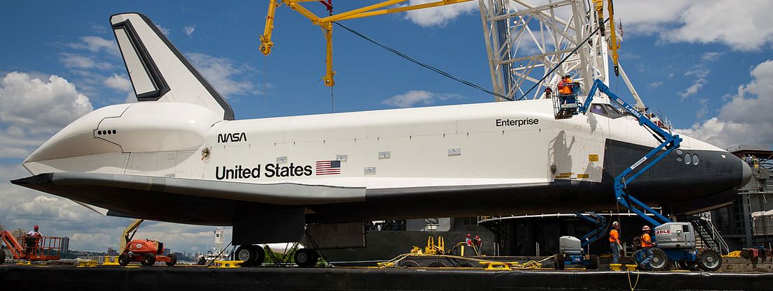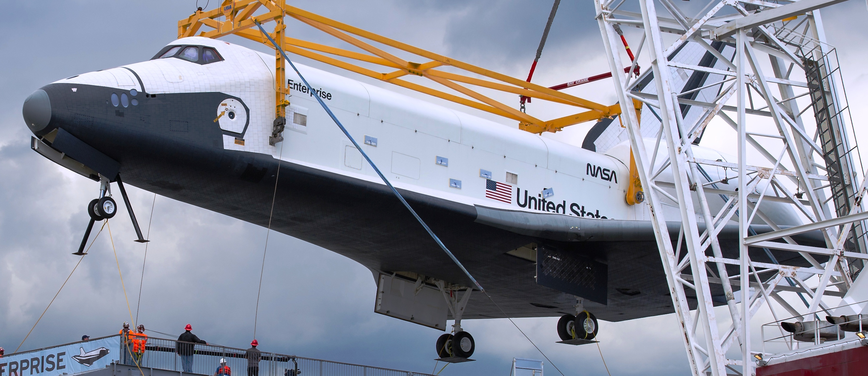Space Shuttle Enterprise is lifted off of a barge and onto the Intrepid Sea, Air and Space Museum.