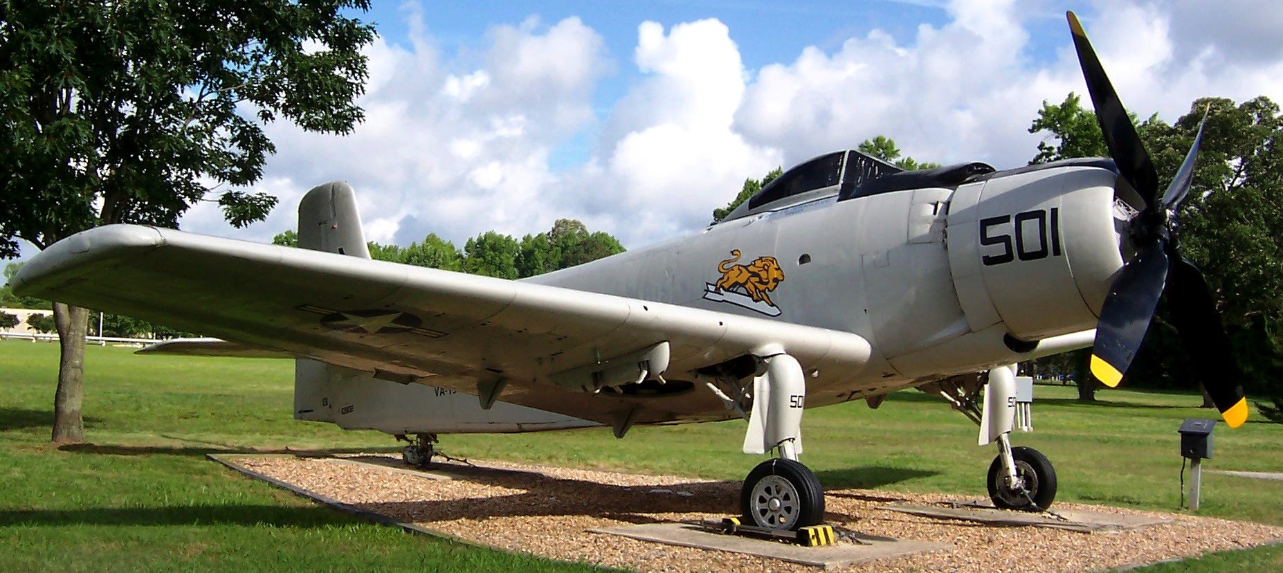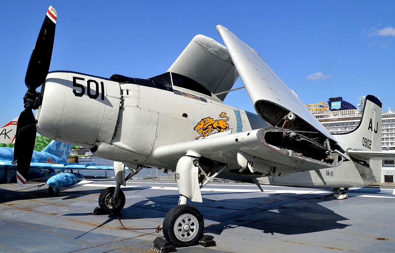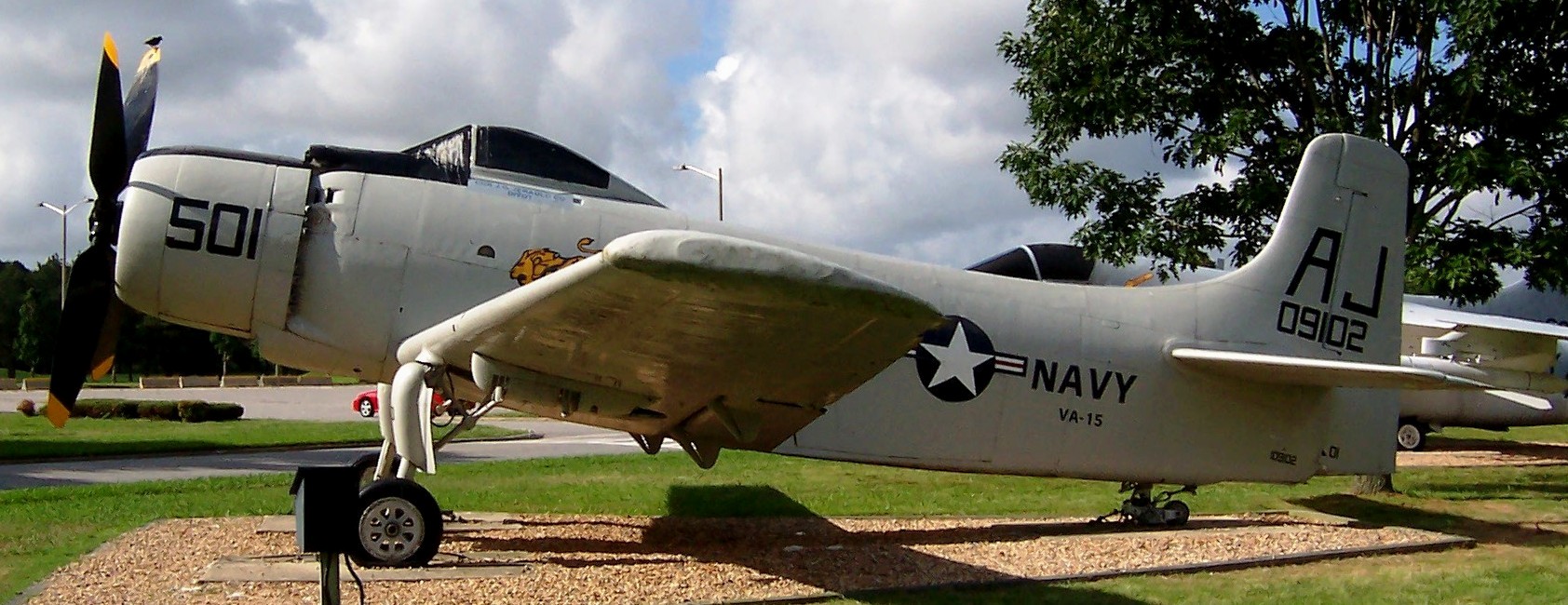 Douglas XAD-1 Skyraider (BuNo. 09102), AJ-501, C/N 1930. This is one of the prototype Skyraiders which were originally designated XBT2D-1 and were given Bureau numbers from a cancelled batch of SB2D-1 Destroyers. Previously part of the gate collection at NAS Oceana, Virginia, it is now on display, still in VA-15 markings, on the deck of USS Intrepid.