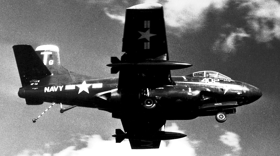 Douglas F3D-2 Skyknight (BuNo. 127072) of Fighter Squadron VF-14 Top Hatters, Air Task Group 201 (ATG-201), approaching the aircraft carrier USS Intrepid (CVA-11) during operations in the Western Atlantic between September and November 1954. (USN Photo)