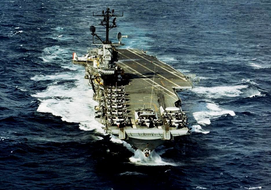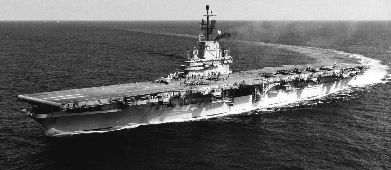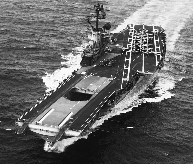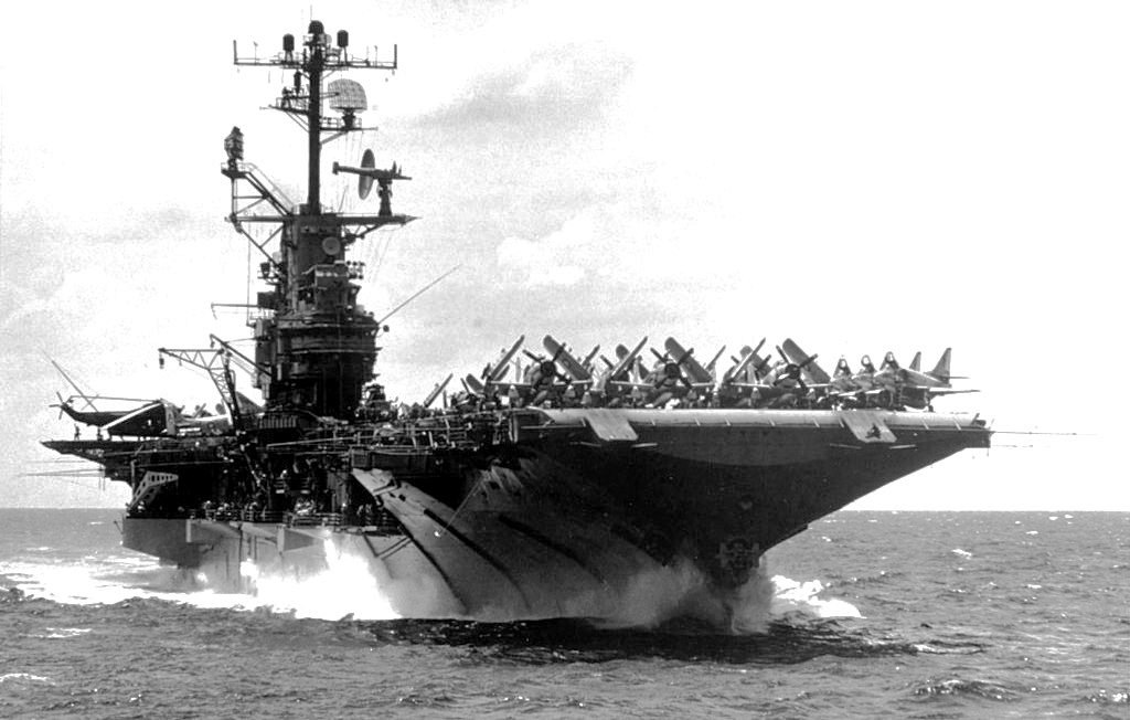 USS Intrepid (CVS-11) steaming in the South China Sea on 13 September 1966, with aircraft of Attack Carrier Air Wing 10 (CVW-10) parked on the flight deck. CVW-10 was assigned to the USS Intrepid for a deployment to Vietnam from 4 April to 21 November 1966.