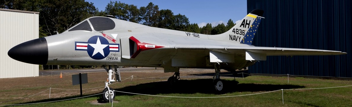 Grumman F-9J Cougar (BuNo. 141117), E-210, F-9F-8, VF-61. This Courgar is on loan from the National Museum of Naval Aviation. It was built in Grumman’s Bethpage factory in 1955 and retired from active service in 1965. It previously served as a gate guard for Naval Weapons Station Earle, and later was displayed at a playground in Wall Township, New Jersey.
