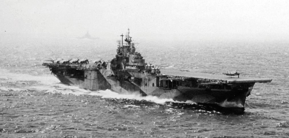USS Intrepid (CV-11) operating in the Philippine Sea in November 1944. Note the Grumman F6F Hellcat fighter parked on an outrigger forward of her island.
