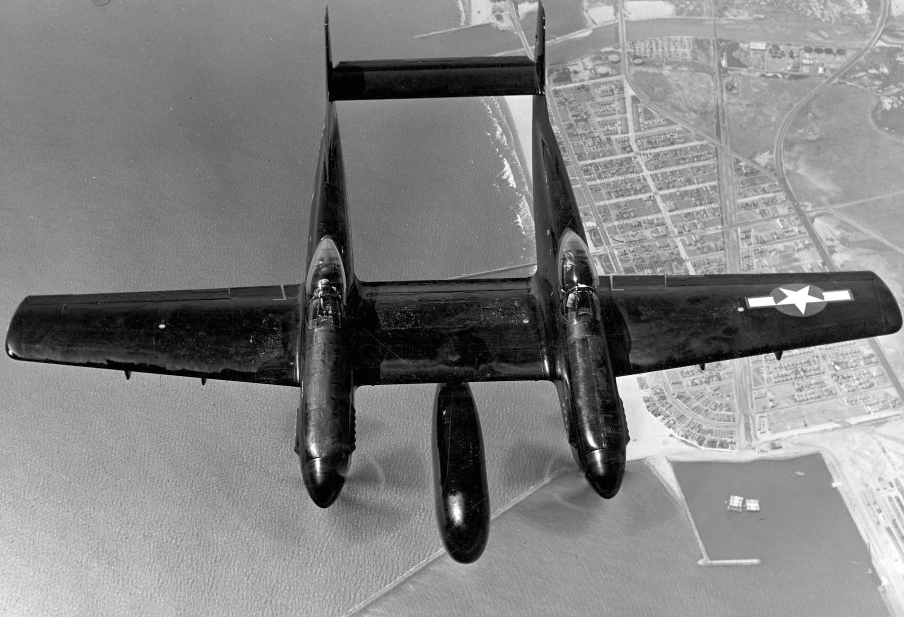 North American F-82C (Serial No. 44-65169), coded PQ-169, flying over Seal Beach, California. This F-82C in black night fighter motif. The large pod that carries a radar array under the wing.