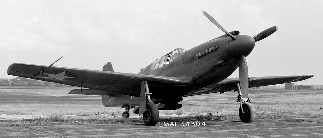 North American NA-73 Mustang Mk. I, RAF (Serial No. AL958) being test-flown at Inglewood, California, in October 1942. This Mustang was one of the original batch of 300 aircraft ordered by the Royal Air Force in December 1940 before the lend-lease act. Note that the fighter wears U.S. national insignias that were used by U.S. forces up to April 1942.
