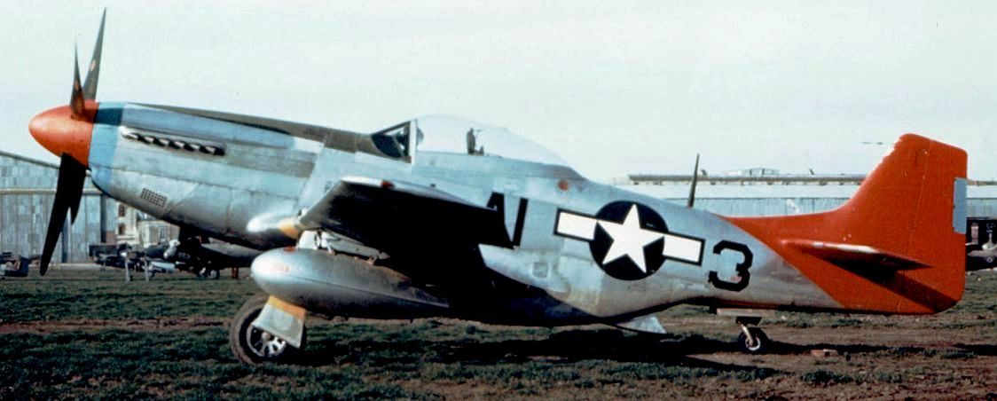 North American P-51D Mustang (Serial No. unknown), N-3, wearing signature red tail of the 332nd Fighter Group known as the Tuskegee Airmen, ca 1945. The red markings that distinguished the Tuskegee Airmen included red bands on the noses of P-51s as well as a red rudder; the P-51B and D Mustangs flew with similar color schemes, with red propeller spinners, yellow wing bands and all-red tail surfaces.
