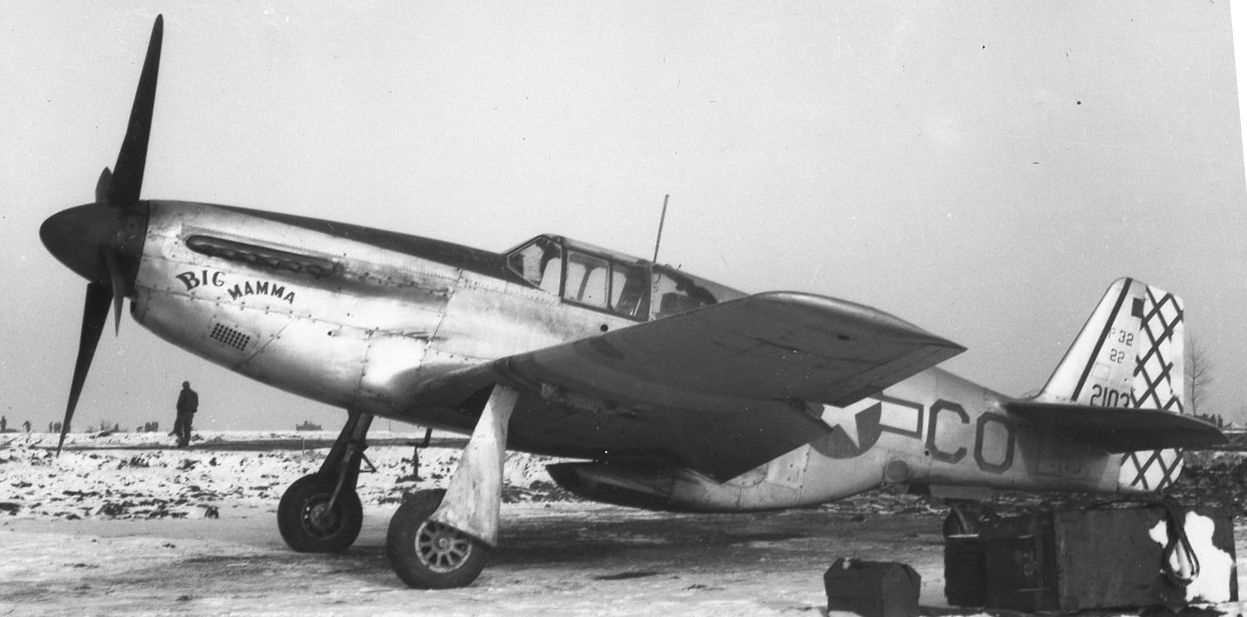 North American F-6C Mustang (Serial No. 42-103–), CO, “Big Momma”, 111th Tactical Reconnaissance Squadron, ca 1944. In June 1943 111th Tactical Reconnaissance Squadron, flying Allison engined F-6A or F-6B Mustangs (taken from a British order of Mk. IAs), became the eyes of the 7th Army in Sicily, on Operation Husky. They were temporarily assigned to the 5th Army in Italy, but returned in July 1944 in time to support the 7th Army’s invasion of southern France, on Operation Dragoon. In addition to the older F-6A and F-6B Mustangs, they began receiving F-6C Mustangs (the photo recon version of the P-51C). The 111th remained with the 7th Army through the end of the war. From VE Day until December 1945, the Squadron served in the occupation force, and conducted postwar photo-mapping of the devastation in France.