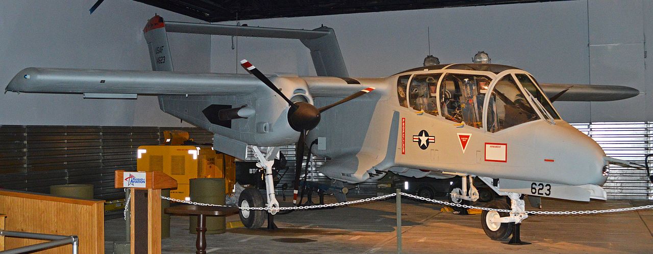 The North American Rockwell OV-10 Bronco is an American twin-turboprop light attack and observation aircraft. It was developed in the 1960s as a special aircraft for counter-insurgency (COIN) combat, and one of its primary missions was as a forward air control (FAC) aircraft. It can carry up to 3,200 lb (1,450 kg) of external munitions and internal loads such as paratroopers or stretchers, and can loiter for three or more hours. (Wikipedia)