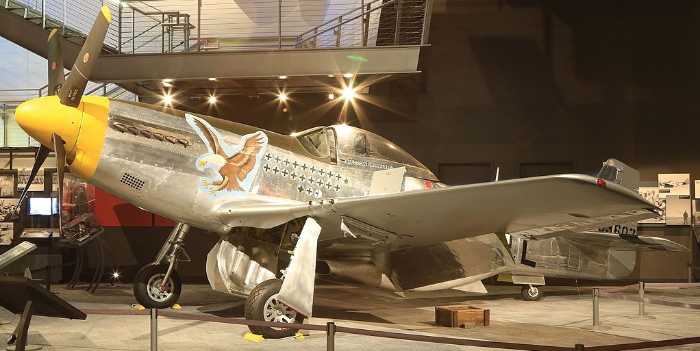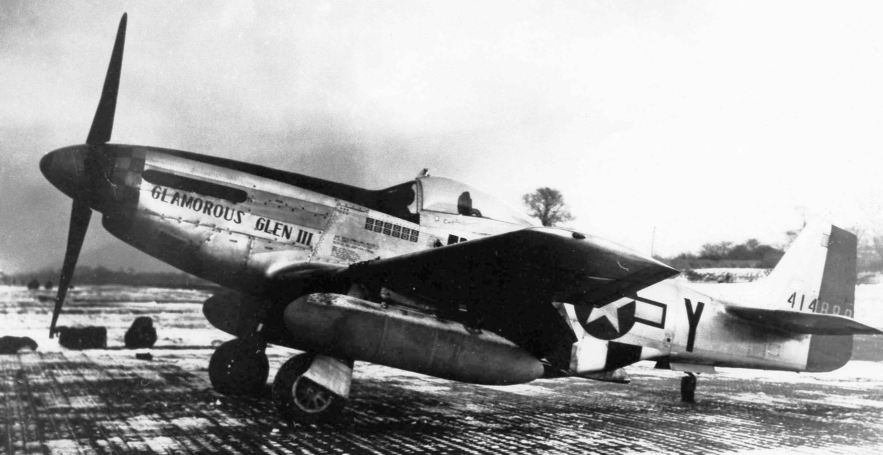 North American P-51D-10NA Mustang (Serial No. 44-14888), “Glamourous Glen III” of the 8th AF, 357th FG, 363rd FS, flown by Chuck Yeager when he achieved most of his 12.5 kills, including two Me 262s, shown here with twin 108-gallon (409-l) drop tanks fitted in England during the Second World War, ca winter of 1944/1945.