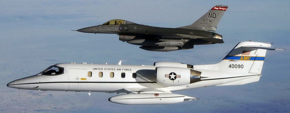 General Dynamics F-16A Block 15L Fighting Falcon, North Dakota Air National Guard alongside the first Gates Learjet C-21A (Serial No. 84-0090) to join the 119th Fighter Wing as it flies into Fargo, North Dakota (USA), on 10 January 2007.