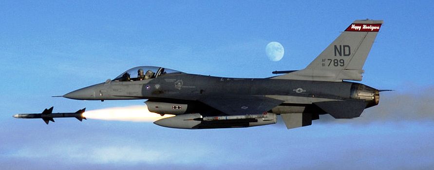General Dynamics F-16A Fighting Falcon (Serial No. 81-0789), 119th Fighter Wing, firing an AIM-7 Sparrow air-to-air missile.