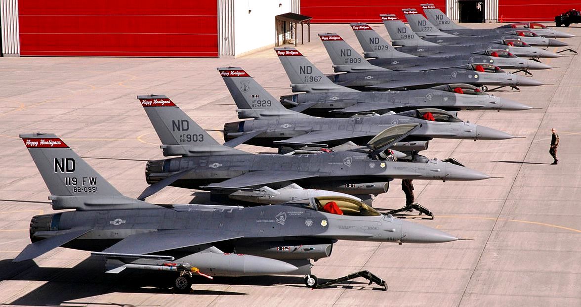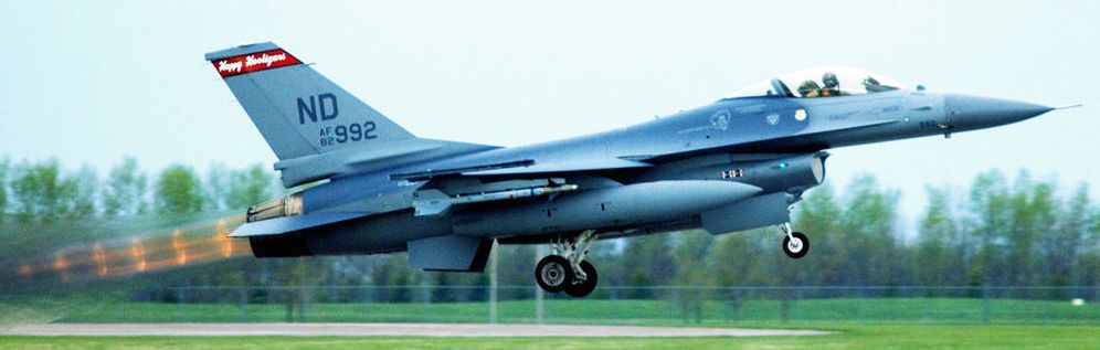 General Dynamics F-16A Block 15N Fighting Falcon (Serial No. 82-0992) aircraft assigned to the 178th Fighter Squadron, 119th Fighter Wing, North Dakota Air National Guard, takes off for a record setting mission from Fargo, North Dakota, on 14 May 2003. “The Happy Hooligans” unit had surpassed the 60,000 accident-free flying hours mark in the aircraft overall, and had amassed over 132,400 hours without a major accident (“Class A mishap”), covering more than 30 years.