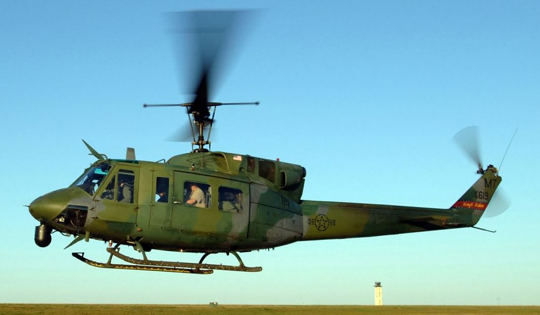 Bell UH-1N Iroquois helicopter (Serial No. 69-6619) from the 54th Helicopter Squadron, 91st Missile Wing Rough Riders, takes off at Minot Air Force Base, North Dakota, on 2 September 2005.