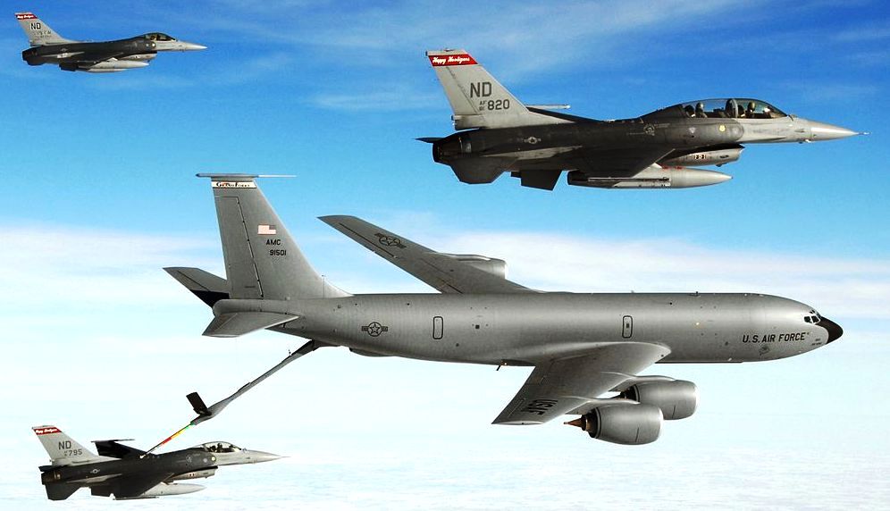 Boeing KC-135R Stratotanker (Serial No. 59-1501), 319th Air Refueling Wing refuels one of two General Dynamics F-16A (Serial Nos. 81-0795 and 82-0951) and one F-16B Fighting Falcon (Serial No. 81-0820) from the 119th Fighter Wing, North Dakota Air National Guard over North Dakota on 16 January 2007.