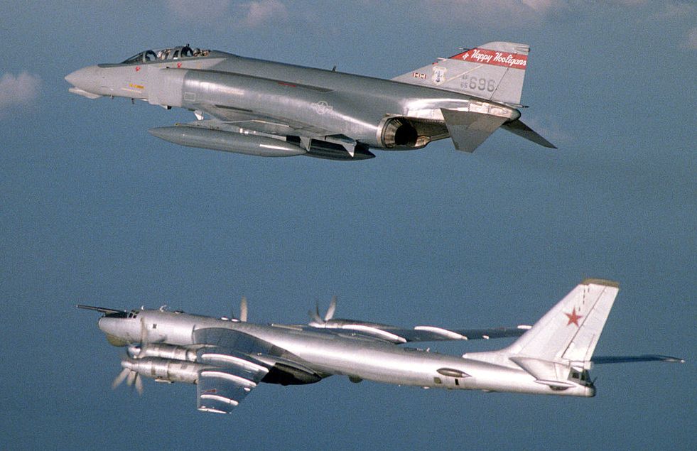 McDonnell F-4D-28-MC Phantom II (Serial No. 65-0696) assigned to the 119th Fighter Group Happy Hooligans, North Dakota Air National Guard, intercepting a Soviet Tupolev Tu-95 Bear bomber aircraft over the Arctic Ocean, during a flight to Keflavik, Iceland in 1983. Eight Russian Tu-95s were intercepted by 119th FG pilots during the deployment to Iceland.
