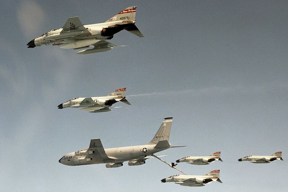McDonnell F-4D Phantom II aircraft assigned to the 178th Fighter Squadron, 119th Fighter Wing, “The Happy Hooligans”, North Dakota Air National Guard, conduct mid-air refueling from a Boeing KC-135E Stratotanker (Serial No. 58-0024) from the 150th Air Refueling Squadron, 108th Air Refueling Wing, New Jersey Air National Guard, in 1985.