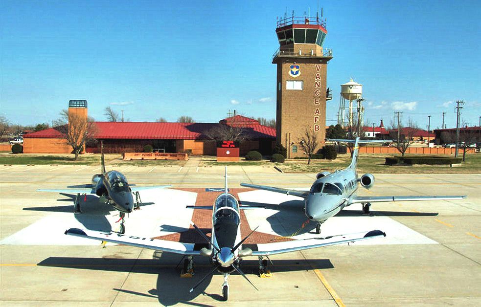 Aircraft of the 71st Flying Training Wing. From left: A T-38 Talon, T-6A Texan II, and a T-1 Jayhawk are posed in front of the base control tower on the Vance flightline.