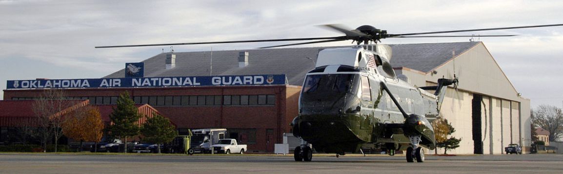 A U.S. Marine Corps Sikorsky VH-3D Sea King from Marine helicopter squadron HMX-1, on the runway at the Oklahoma Air National Guard Base, Tulsa, Oklahoma, on 9 December 2004.
