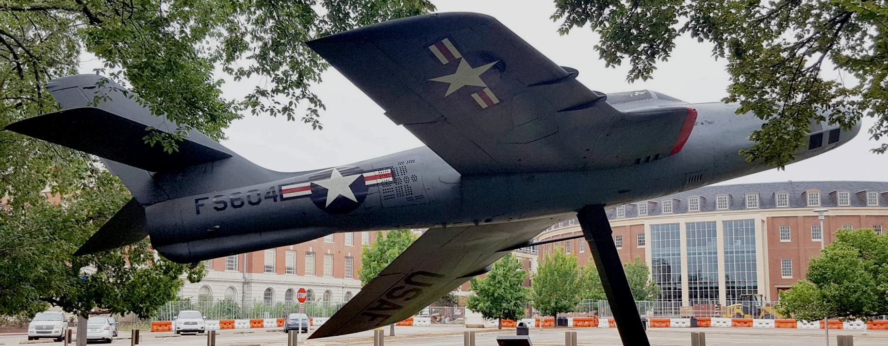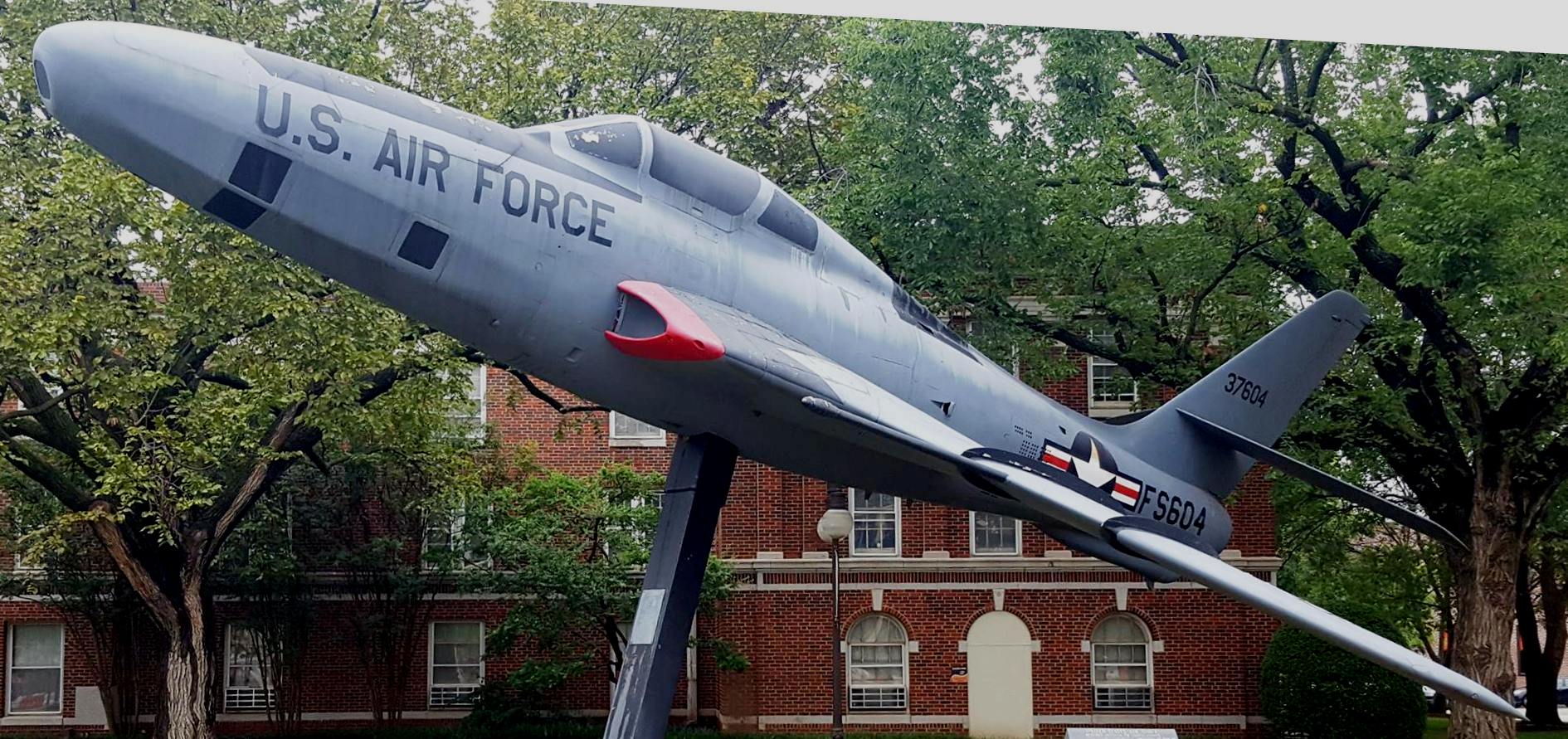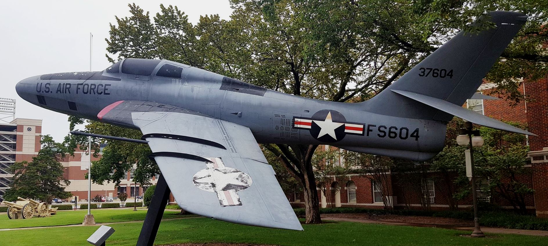 Republic RF-84F Thunderflash (Serial No. 53-7604), mounted on a pylon at Oklahoma State University.