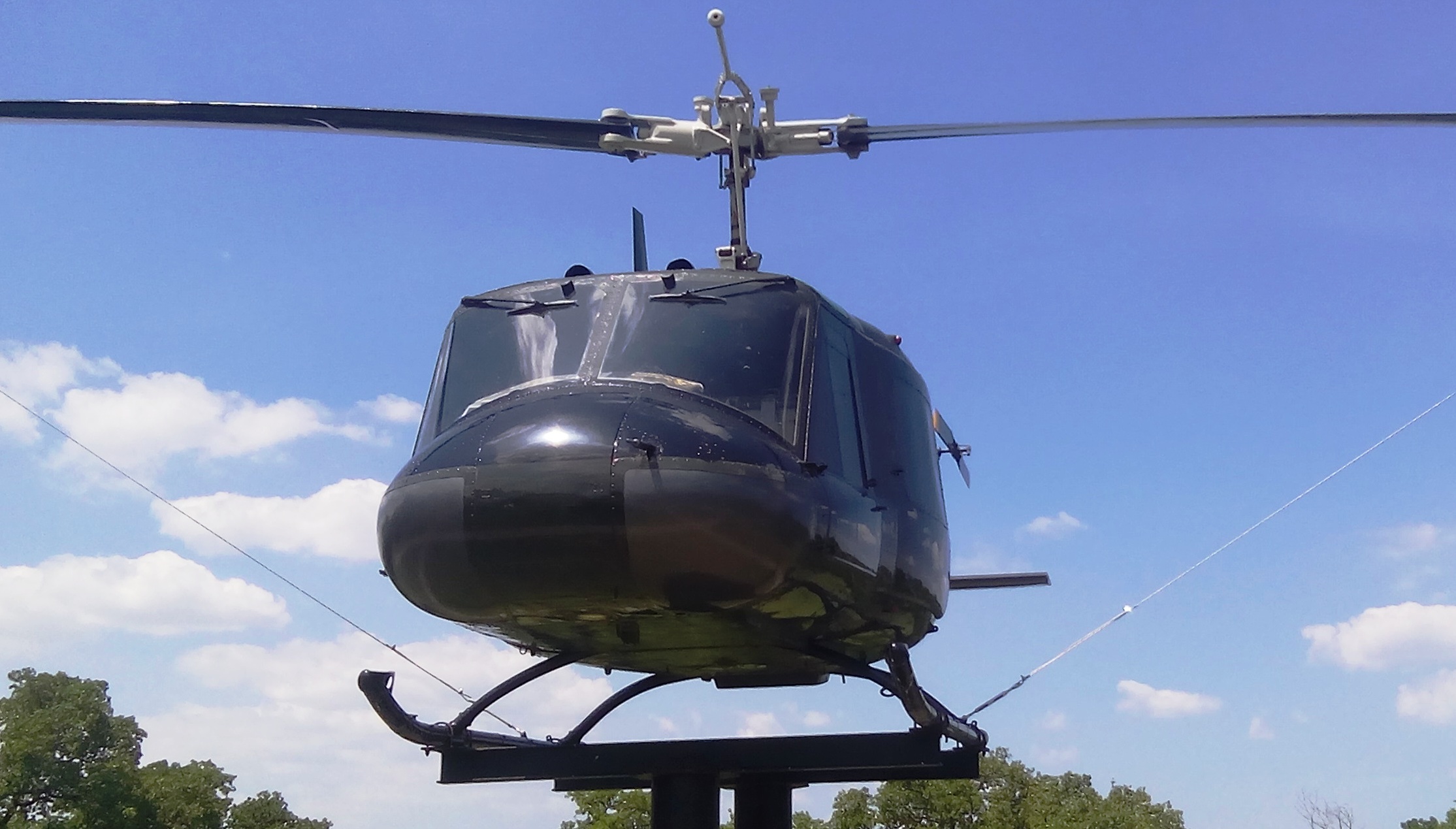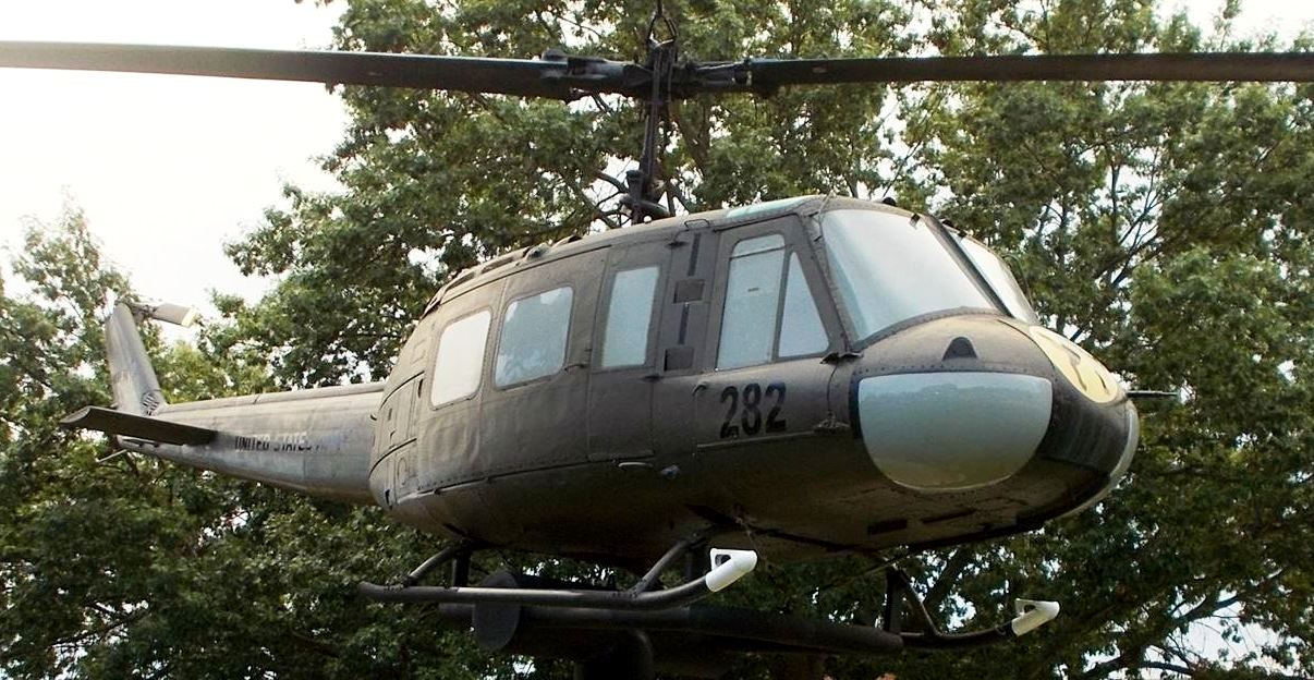 Bell UH-1D Iroquois helicopter (Serial No.), 282, mounted on a pylon in Woodland Veterans Park.