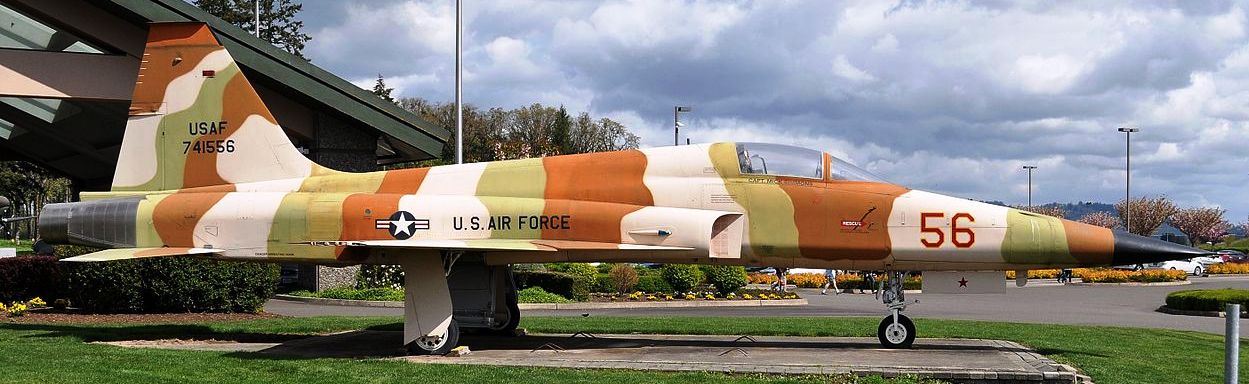 Northrup F-5E Tiger II (Serial No. 74-1556).  This aircraft was delivered to RAF Alconbury in the UK on 24 June 1976, and carried the ‘Old Lizard’ colour scheme.  By 1983 this had been changed to a European version of the ‘Sand’ scheme used at Nellis AFB, Nevada, where one of the browns had been replaced by a green (the medium grey in the photo).  By 1986 the aircraft had been repainted in the ‘Snake’ scheme.  The aircraft was transferred to the US Navy as (BuNo. 741556), departing Alconbury on 22 July 1988.  It was retired by the Navy in 2005, and is now painted as a USAF aggressor aircraft at Evergreen Aviation Museum, McMinnville.
