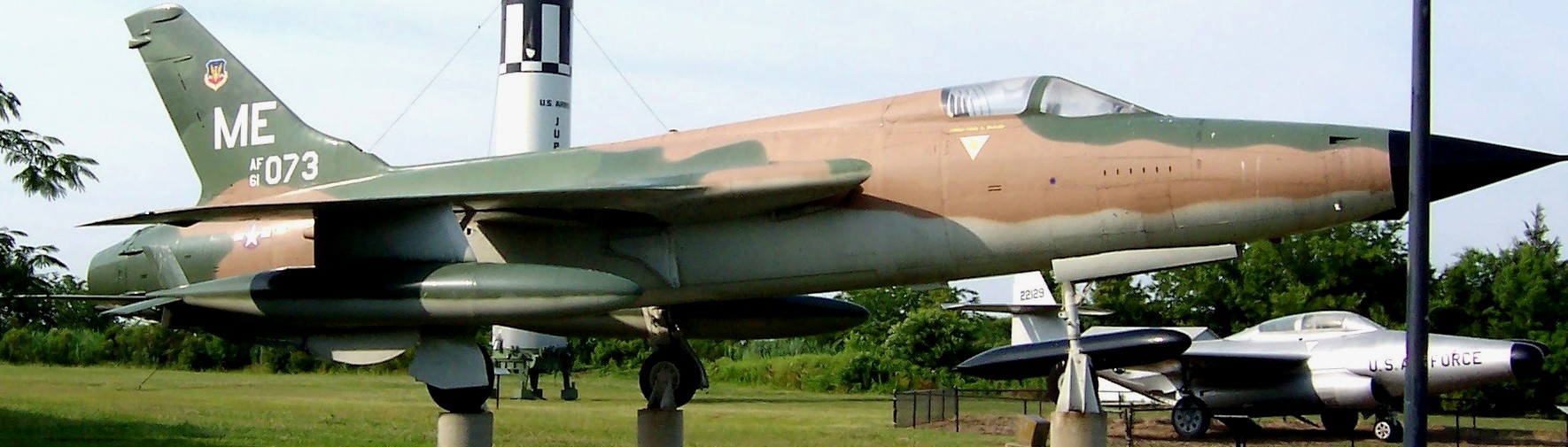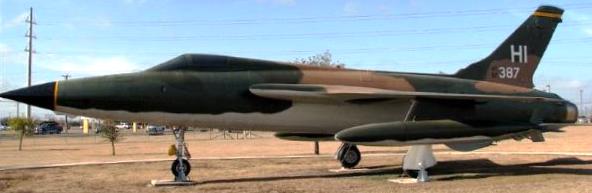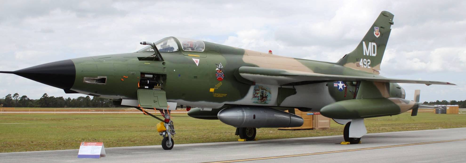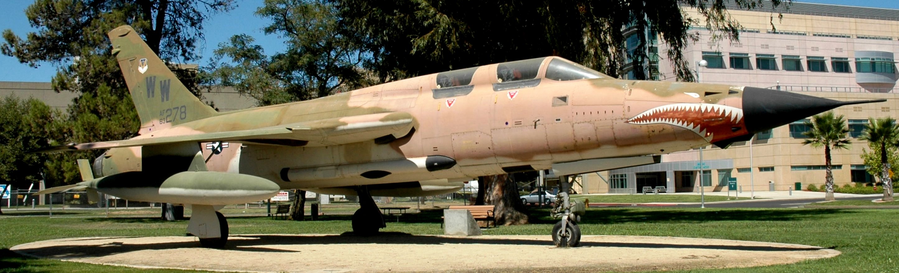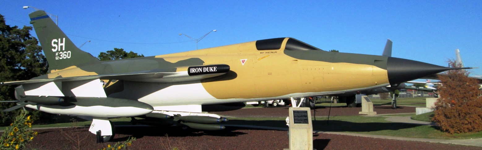 When the Thunderchief entered service it was the largest single-seat, single-engine combat aircraft in history, weighing approximately 50,000 pounds (23,000 kg).[2] It could exceed the speed of sound at sea level and reach Mach 2 at high altitude.[3] The F-105 could carry up to 14,000 lb (6,400 kg) of bombs and missiles. The Thunderchief was later replaced as a strike aircraft over North Vietnam by both the McDonnell Douglas F-4 Phantom II and the swing-wing General Dynamics F-111 Aardvark. However, the “Wild Weasel” variants of the F-105 remained in service until early 1984, at which point they were replaced by the specialized F-4G “Wild Weasel V”. (Wikipedia)
