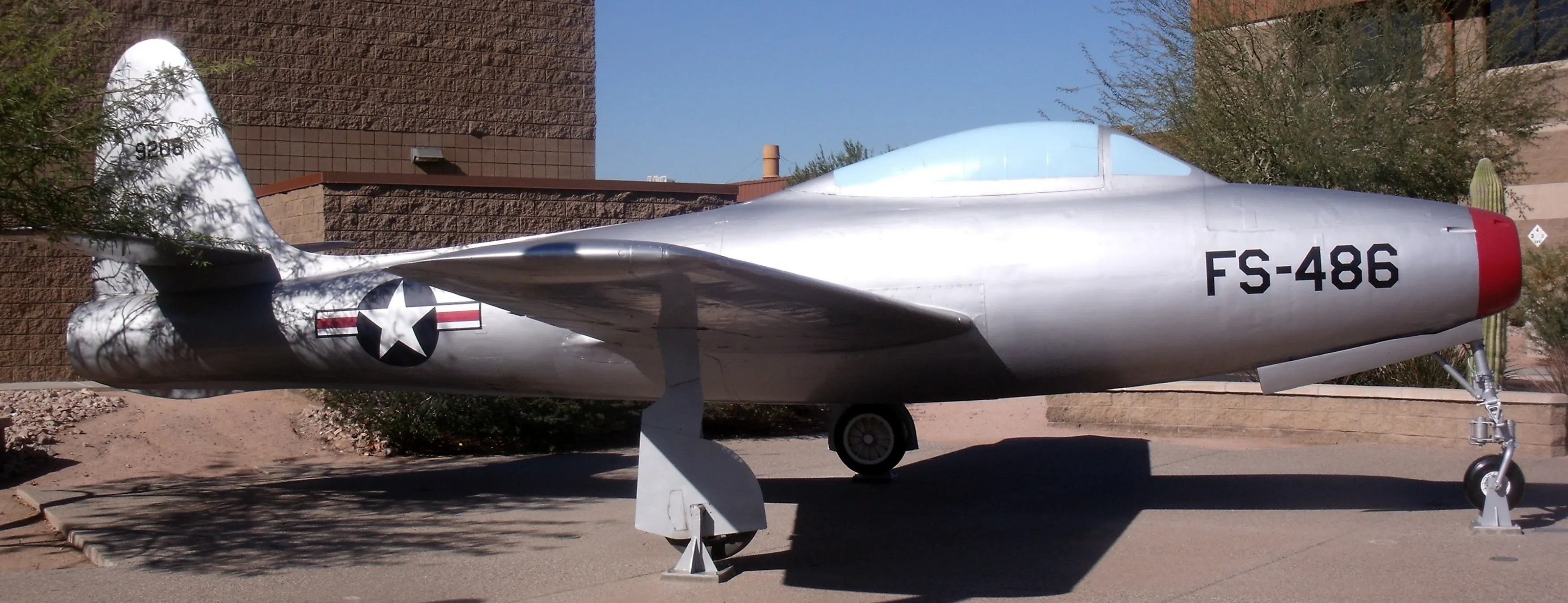 A total of 4457 Republic F-84 Thunderjet jet fighters were built, serving with 14 airforces. Many examples are preserved and on display around the world, often in aviation museums.