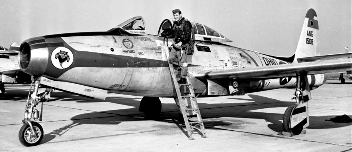 Republic F-84E-25-RE Thunderjet (Serial No. 51-508) from the 162nd Fighter Squadron, Ohio Air National Guard. The 162nd FS flew the Thunderjet from 1955 to 1957.