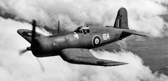 A Royal Navy Vought Corsair Mk.II from 1833 Naval Air Squadron in flight during a training mission near Naval Air Station Quonset Point, Rhode Island, in 1943.