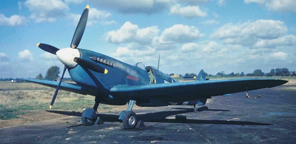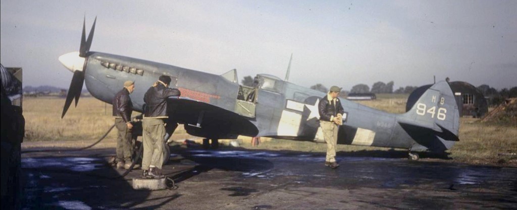Supermarine Spitfire Mk. Vb of the USAAF 7th Photo Reconnaissance Group, Mount Farm, Oxfordshire, England, in 1944. Identified as “war weary”, this aircraft was being used as a squadron “hack.”