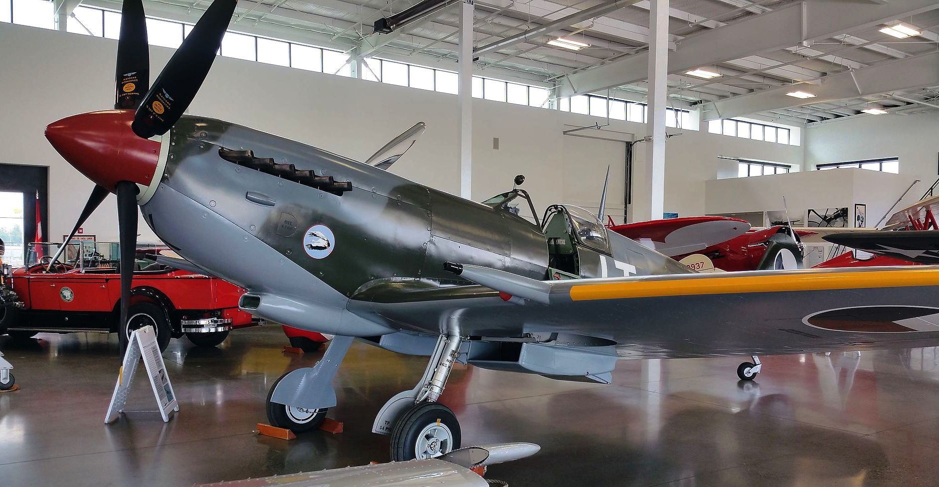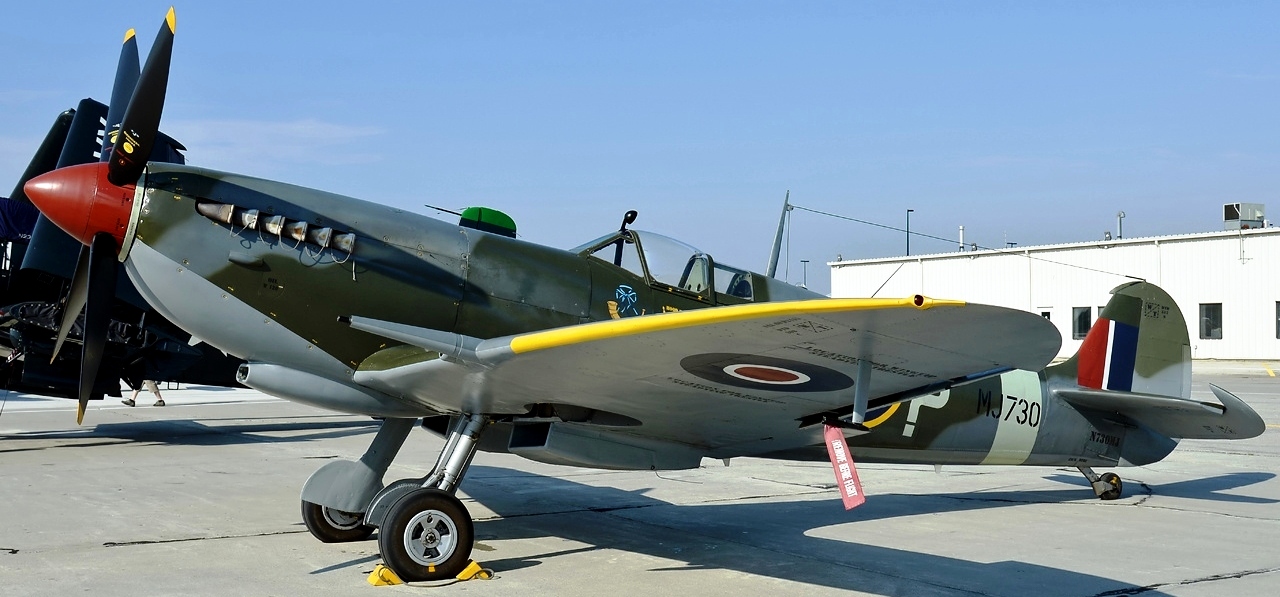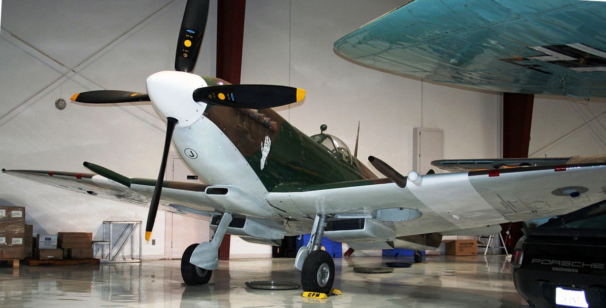 Supermarine Spitfire LF Mk. IXe (Serial No. MJ730), Reg. No. N730MJ. Airworthy. Owned by Jerry Yagen and based at the Military Aviation Museum, Virginia Beach, Virginia. In April 1944 MJ730 was assigned to No. 417 Squadron RCAF, then operating in Italy. It flew 95 missions as escort for American bombers over northern Italy. In June 1946, it was transferred to the Italian Air Force. In 1947, MJ730 was used in the film Thunderbolt!, directed by William Wyler. In 1951 it was sold to the Israeli Air Force, and after service ended up in an Israeli playground. In the 1970s, a collector transported it back to Britain for restoration. FedEx founder Fred Smith bought it in 1986.