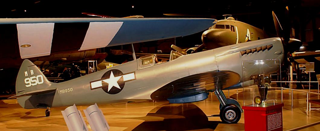Supermarine Spitfire PR Mk. XI, RAF (Serial No. PA908). This aircraft is painted in an overall photo-reconnaissance (PR) Blue colour scheme marked to represent RAF (Serial No. MB950) of the 7th Photo Reconaissance Group, based at Mount Farm in Oxfordshire, England, in 1944. It is on display at the National Museum of the United States Air Force, Wright-Patterson Air Force Base, near Dayton, Ohio.