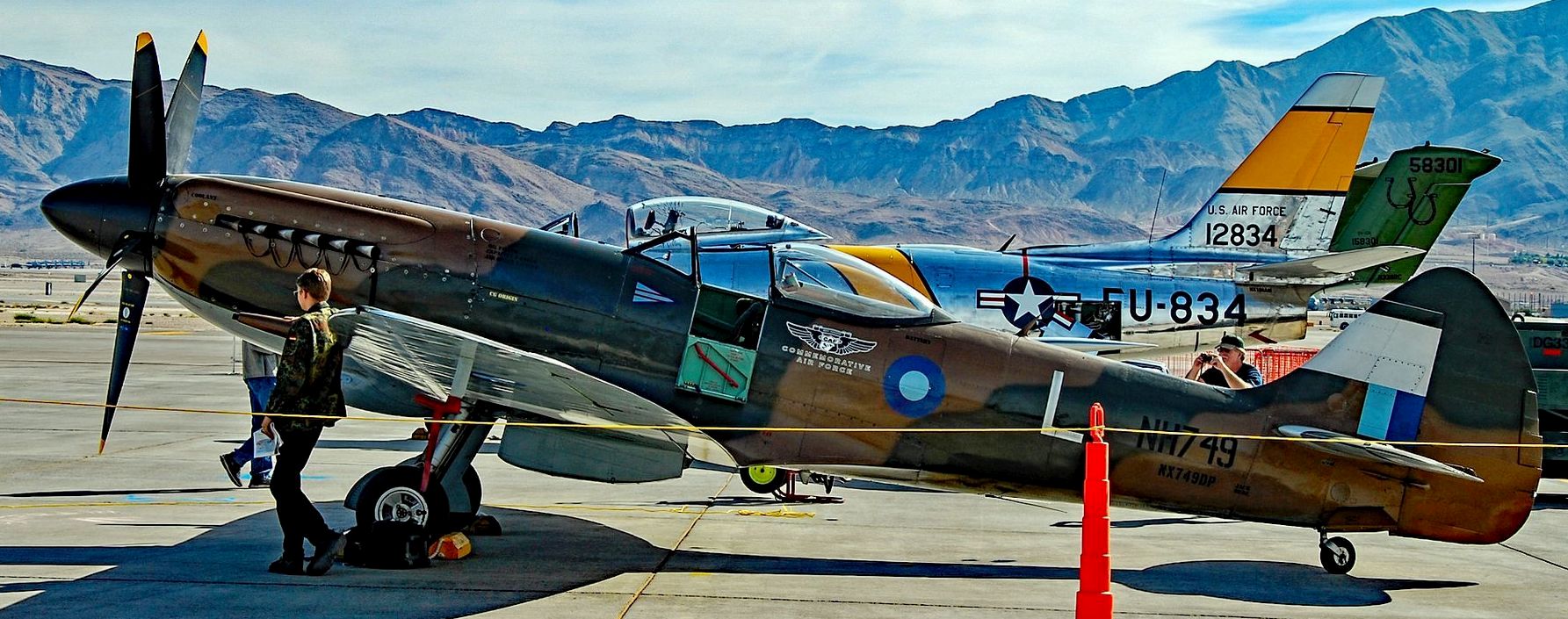 Supermarine Spitfire FR Mk. XIVe (Serial No. NH749), Reg. No. N749DP. Airworthy. Owned and operated by the Commemorative Air Force, based at Camarillo airport, Southern California. Built in late 1944, NH749 was shipped to India in July 1945 to serve with the RAF’s South East Asia Command (SEAC) squadrons. Rendered surplus to requirements by the Japanese surrender in August 1945, NH749 was placed in storage and sold to the Indian Air Force in late 1947. In 1978 it was rediscovered and transported to England by the Hayden-Bailey brothers. After restoration to flying condition, NH749 was sold to Keith Wickenden with the civil registration G-MXIV. NH749 was later sold to David Price’s Museum of Flying in the United States and was operated from 1985 to 2005 when it was once again sold, this time to the CAF. It is painted in a SEAC colour scheme.